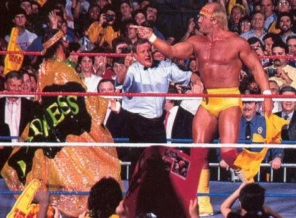 Glenn Butler: In a rare move for late-80’s WWF, Jesse Ventura breaks kayfabe during the introductions for this match and issues a shoot comment when he intones “This is the biggest match in the history of professional wrestling.” Argumentum ad populum is a logical fallacy, but it remains difficult to dismiss in this case, where there were many fantastic wrestlers on the card whom ninety-three thousand people did not buy tickets to see. This match was the highest point of the 80’s boom period, when the WWF’s pop-culture penetration was at its most penetrated, not only in terms of celebrity presence in marginal roles, but in terms of the wrestlers themselves being celebrities, with the Hulkster at the fore. So many parts of the build to this match are iconic: the champagne; the tag matches; the trophies; “LOOK AT ME WHEN I’M TALKING TO YOU.” “We’re friends, Andre, please!” The torn shirt; the cross; “You’re bleeding.” The match itself has many aesthetic pleasures to offer; Andre was definitely breaking down by this point, but his sheer size made any movement he could manage look devastating, and Hogan’s expert selling and absolute mastery over the crowd complete the picture of a truly epic bout. If you’re ever feeling desolate and devastated, look within yourself, and consider: HE SLAMMED HIM!