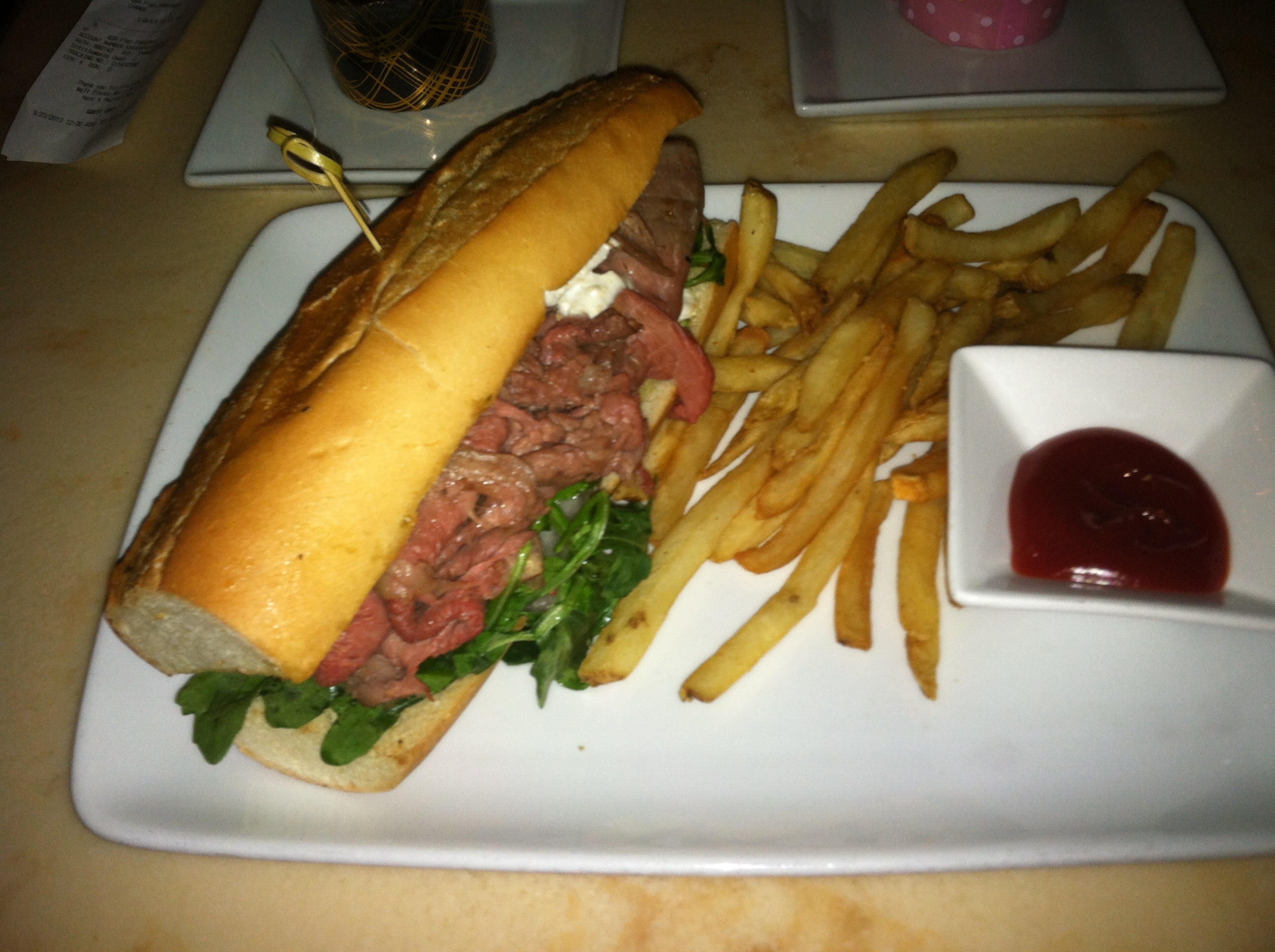 I had the roast beef sandwich. When trying to find the proper description, I noticed that this item had been removed from the menu. Having had this menu item, I cannot argue with their decision. The meat was considerably lacking flavor. The sandwich was also quite dry. In my opinion a simple au jus dipping sauce would have done wonders for this sandwich.
