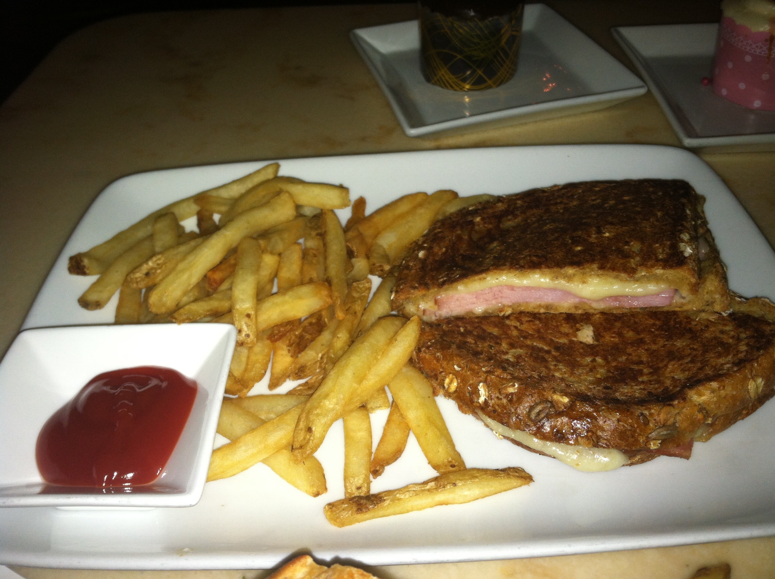 My husband had the other sandwich, and of course, I had to try it! This sandwich is described as “grilled sandwich of carved ham, gyurere cheese, and bechamel.” Honestly, the only thing I got from the description was a grilled ham and cheese sandwich. We looked up bechamel and it is some sort of white cream sauce very popular in French cuisine. That still doesn’t tell me much. All I know is the sandwich was amazing! It was not dry, and it was incredibly flavored. It was definitely worth the $10.99 price.