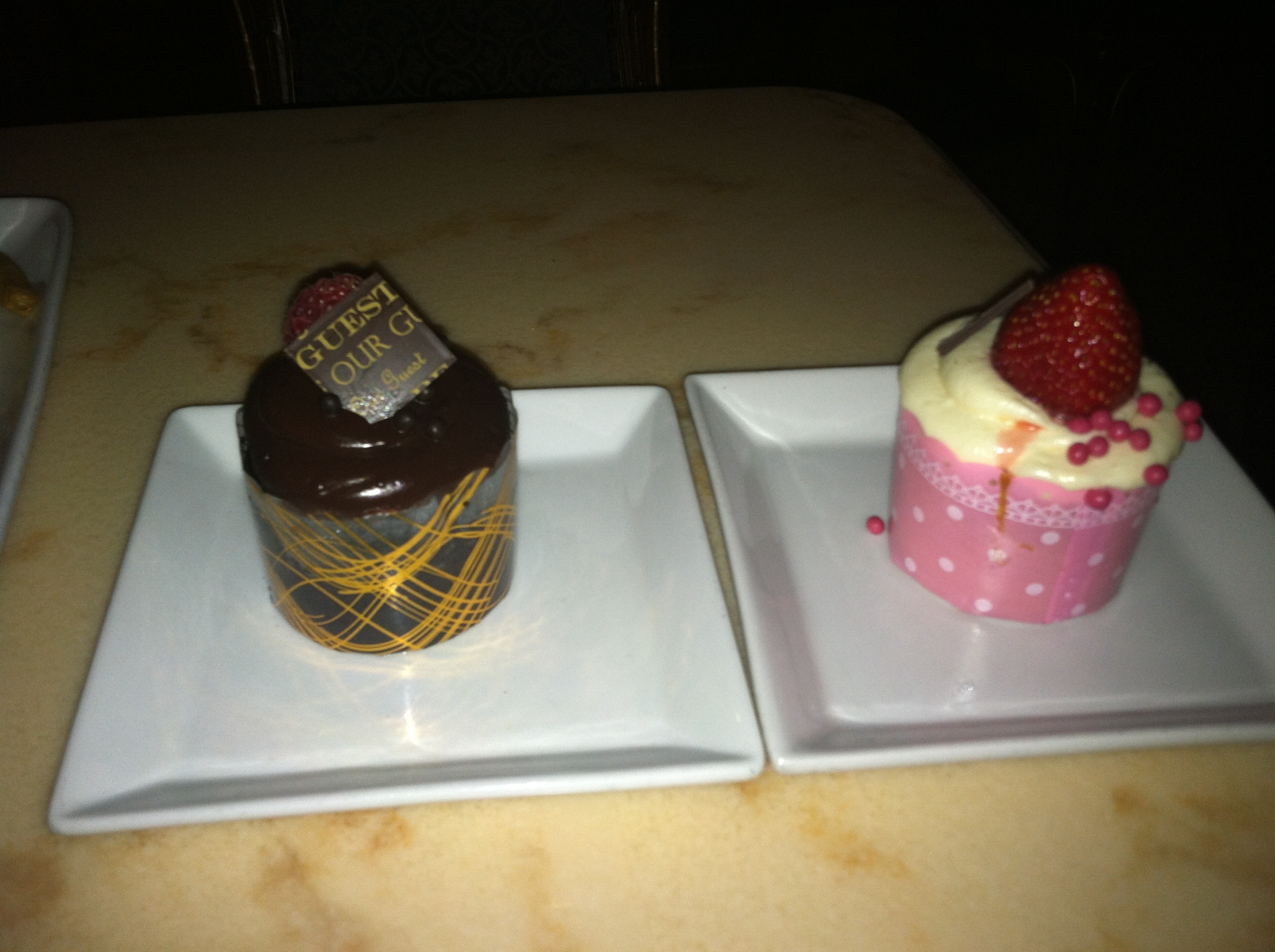 CUPCAKES!!! I bake a lot, so I’m very critical of any baked goods. I am very proud of my cupcakes and get really disappointed in almost every cupcake I try. That being said, I would likely pay a large sum of money to anyone who could get me the recipe and secrets to these cupcakes! The cupcakes were so moist, they almost needed to be eaten with a spoon! The chocolate was a triple chocolate made of a delicate chocolate cake with a smooth ganache icing, filled with a fudge icing, and topped with a dark chocolate square that read “be our guest.” The strawberry was a vanilla cupcake with a strawberry cream cheese icing and topped with a whole, sugared strawberry. For $2.99, they were a bit small, but I would gladly have bought 100 of them if I knew they would have made it home! By far, these are the best cupcakes I have ever eaten! Seriously, if anyone knows the recipe… Email me!