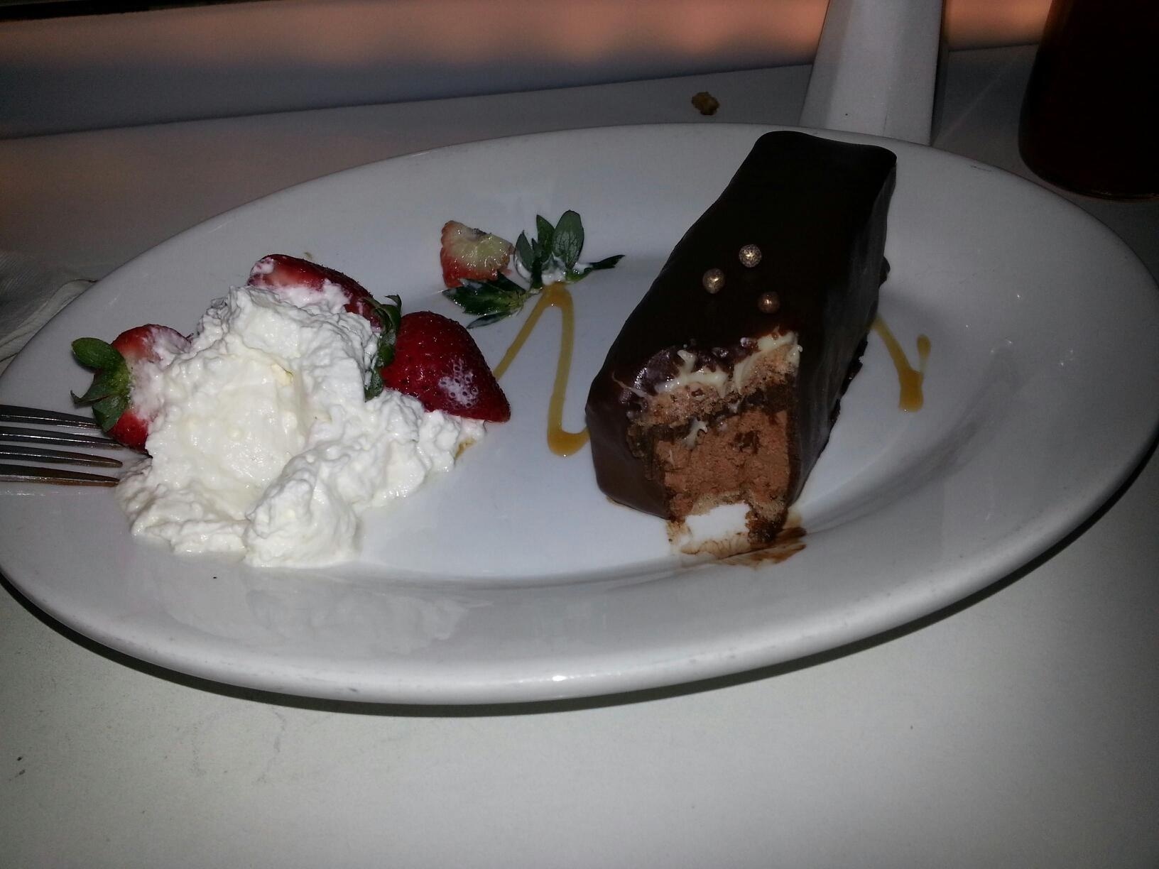 For dessert, my husband got a $4.99 chocolate milkshake that tasted like “a milkshake.” I ordered the pictured above Sci-fi Candy Bar. “White and dark chocolate mousse layered with crispy pearls, sandwiched between sponge cake, and dipped in chocolate ganache.” Basically, it was a twinkie dipped in chocolate. The “crunchy pearls” had become soggy from sitting in the mousse. It wasn’t awful, but it was definitely the worst dessert we had while at Disney.