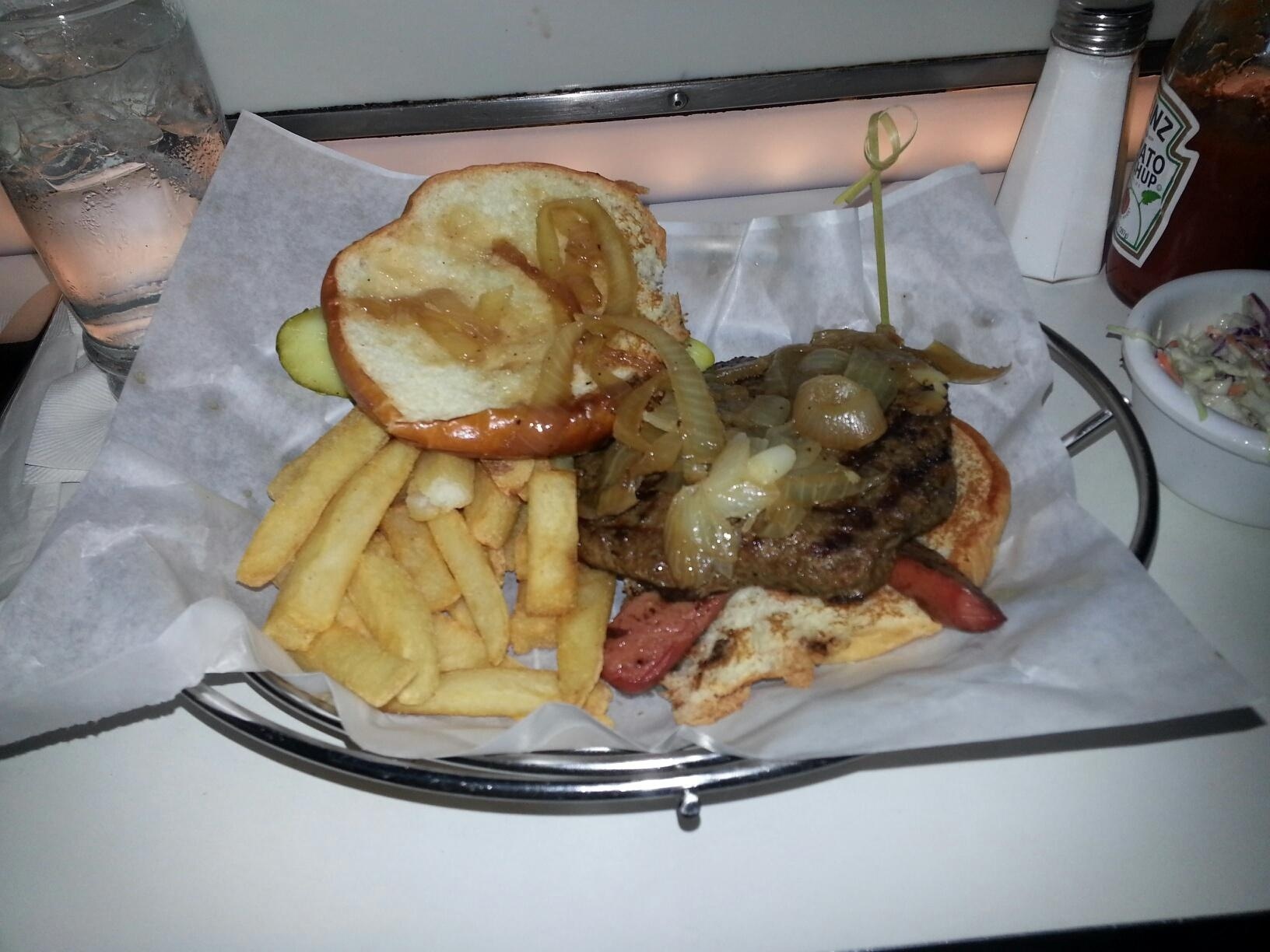The All American Picnic Burger can only be described as a delicious heart attack waiting to happen. This giant burger had a flame broiled angus beef party and was topped with sautéed onions, ketchup, mustard, and a grilled hotdog. Yes a hotdog! It came with sauerkraut as well but I opted against it. This burger was worth every penny of its hefty price. The ONLY thing I could imagine that might have made it better would have been a slice of American cheese!