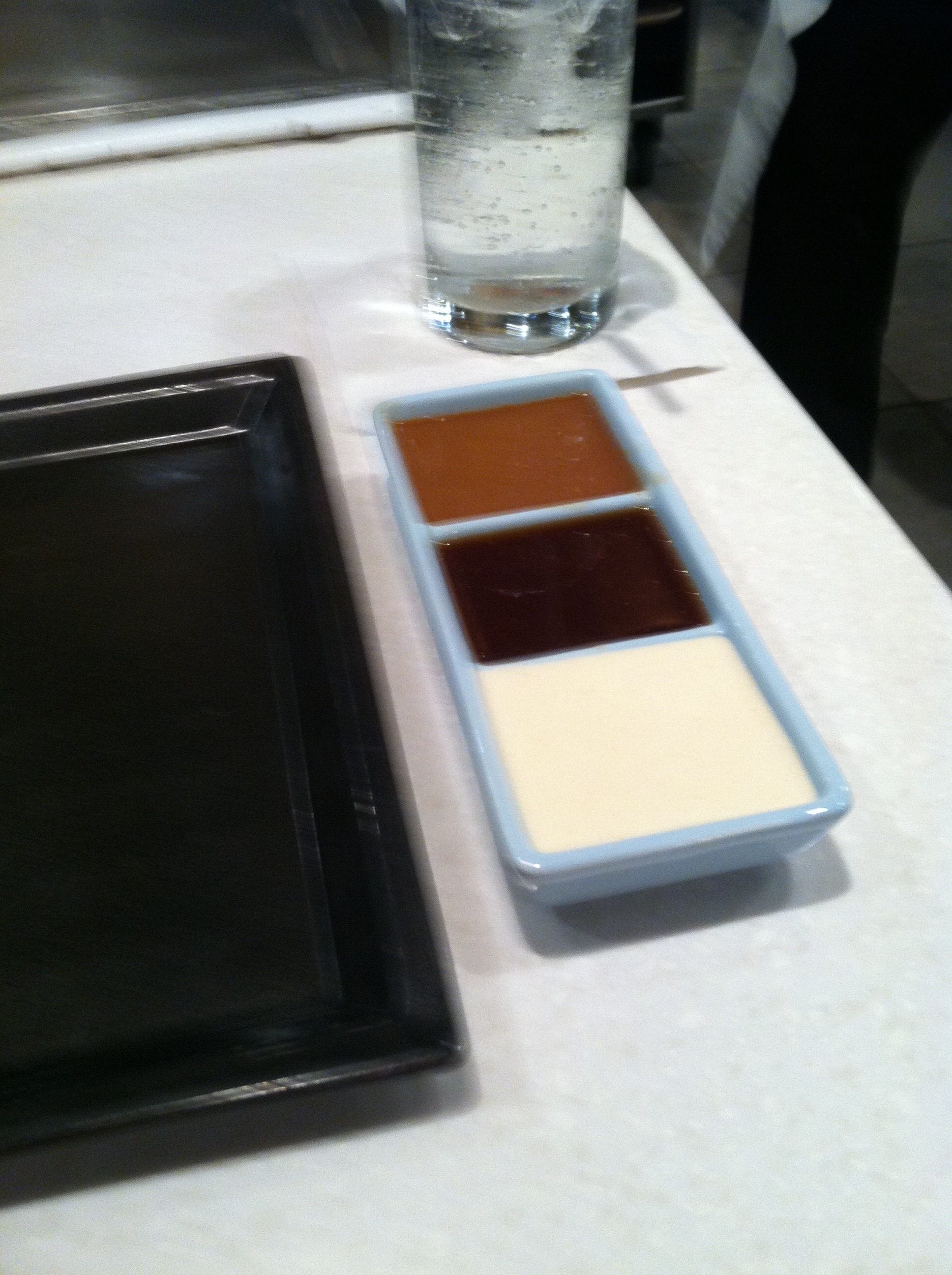 The first thing we got were our sauces. We were given three different ones. The light brown sauce on top was a ginger sauce used for vegetables. The middle sauce (dark brown) was for our seafood and the bottom (white) sauce was for steak.