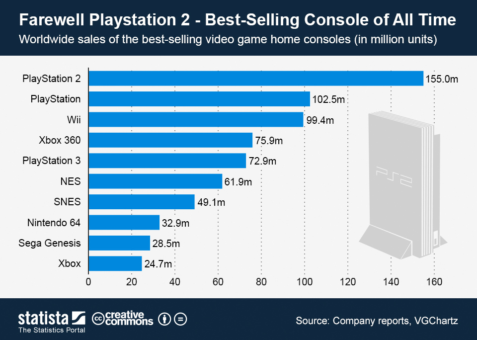 The first thing you should notice about this chart are the notable absences of the Sega Saturn, Sega Dreamcast (DC), and Nintendo GameCube. Both of the Sega consoles sold just under ten million units each while the GameCube (GDN) sold about twenty-two million. During the Wii U’s inaugural year, it was drawing comparisons to the GCN, but now, they say that it would be lucky to reach Dreamcast numbers.