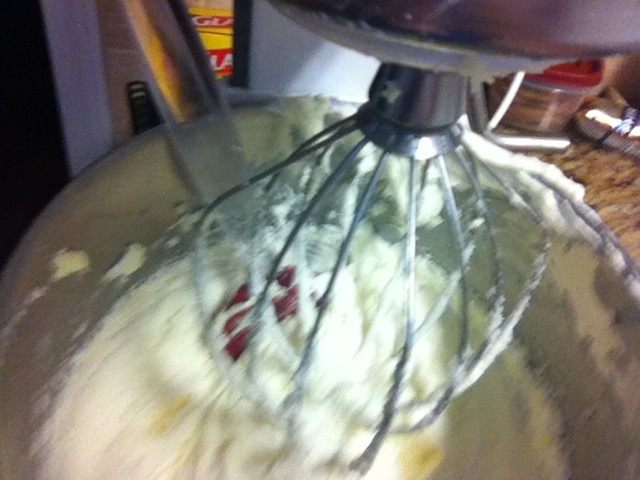 First, cream together 2 sticks (1 cup) of butter, 1/2 cup of Crisco, and 3 cups of sugar. For our none US resident readers Crisco is a solid vegetable shortening. Crisco is the name brand in the US, and it may be sold under a different name in your country. Cream these three ingredients until fluffy. It will look much paler than originally and will look bigger in volume. It is important to make sure it is light and fluffy in order to have the best end result. If you have a stand mixer, I highly recommend using it, but if not, a hand mixer will work just as well. Next, you will mix in five eggs, one at a time. Make sure each egg is fully incorporated before adding the next.