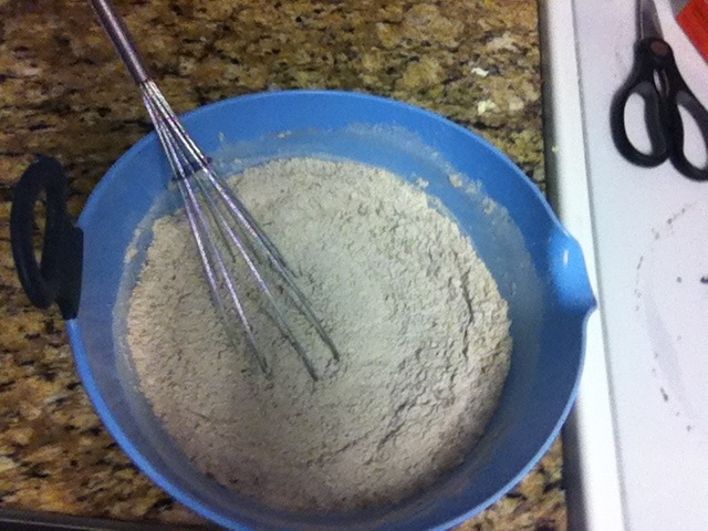 In a separate bowl, using a wisk, mix together 3 cups of all purpose flour, 1/2 teaspoon of baking powder, 1/2 teaspoon of salt, and 4 Tablespoons of cocoa powder. In the picture below I didn’t use the full amount of cocoa. It wasn’t chocolatey enough and you may want to use more than 4 Tablespoons. It’s something you have to play around with and do to taste.