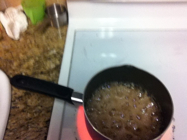 The icing will need to be chilled for a bit in the refrigerator, so let’s make it first! The first thing is making the caramel. This recipe makes an amazing caramel, but cooking sugar to this temperature can be very dangerous! If you are not comfortable making it, you can buy any store bought caramel in liquid form. I think there is even a company that makes caramel melts, like chocolate candy.