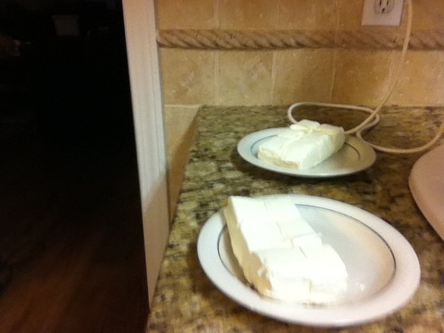 Cut one pound (2– 8oz packages) of cream cheese into 2 inch squares. I just cut mine once down the middle long ways and then into thirds.